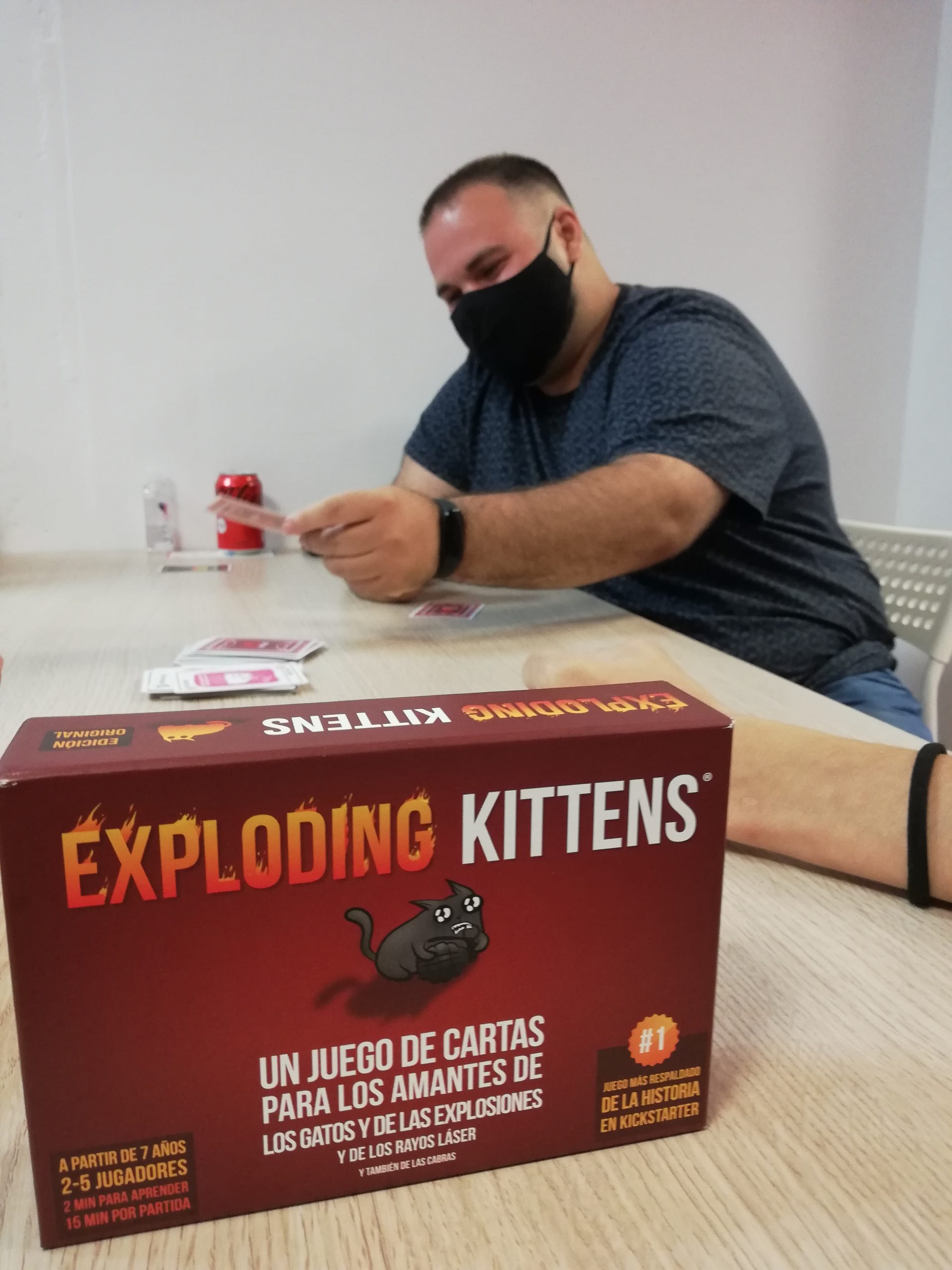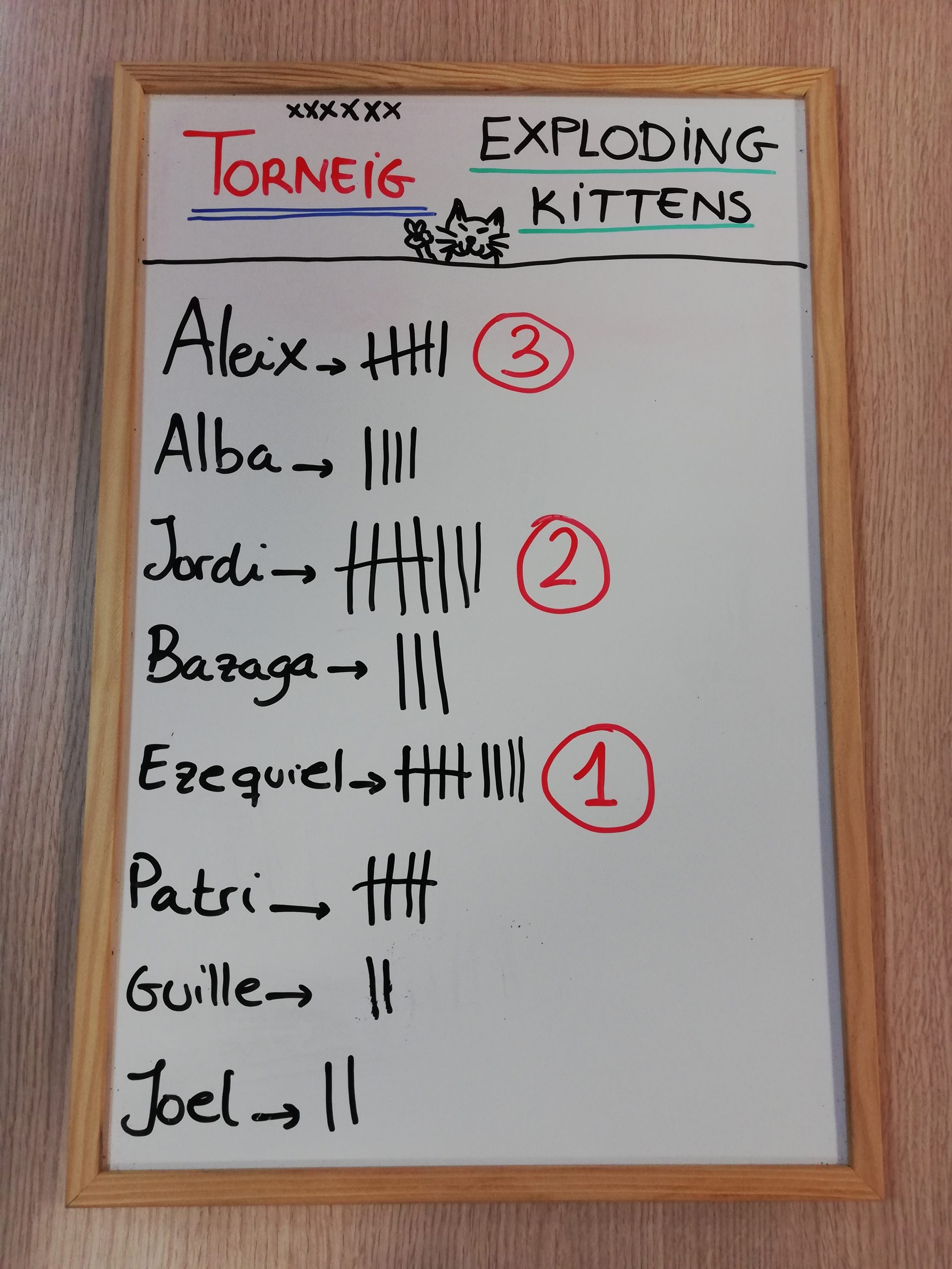 A final de la sisena partida, es va produir un empat a 9 entre dos jugadors: Ezequiel i Jordi. Per desempatar van realitzar una partida a 2 jugadors que va guanyar Ezequiel per convertir-se en el 1r guanyador del Torneig d’Exploding Kittens. Enhorabona!!